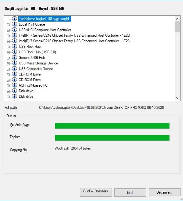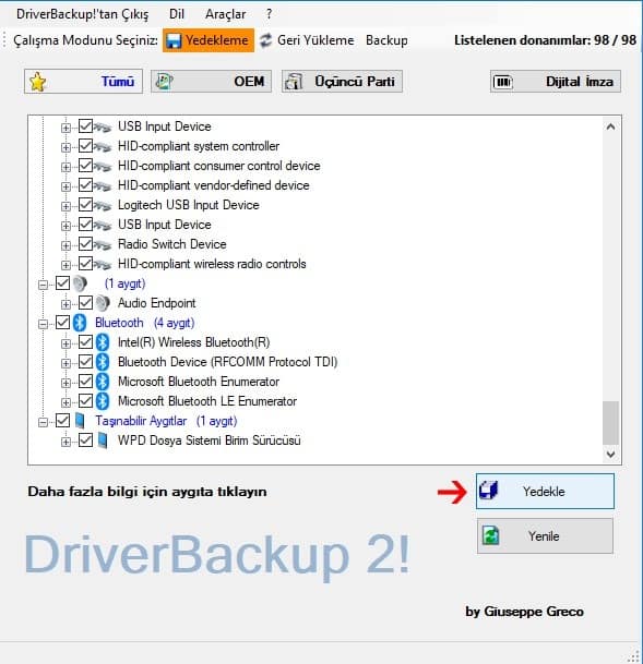 Driver Backup,Başta sürücülerinizi tarayacaktır 3-5 sn bekleyiniz sonrasında tüm sürücüler görüntülenecektir , varsayılan olarak hepsi seçili gelir , (Siz eğerki sadece belirli sürücüleri yedekleyecekseniz sadece onlara tik koyun), Ben tüm sürücülerimi yedekleyeceğimden hiçbir ayara dokunmadım ve sağ alttaki “yedekle” butonuna basın.