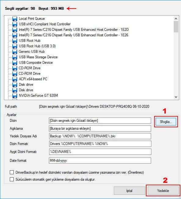 Sonrasında açılan ekranda nereye yedekleyeceğini göstermemiz gerekir bunun için “Dizin” in karşısında yeralan butona basıp (1) yedekleme yerini gösteriyoruz (Türkçeye çeviren buton isminde saçmalamış) ve son olarakta sağ dipteki yedekle butonuna (2) basıp işlemin bitmesini bekleyin.