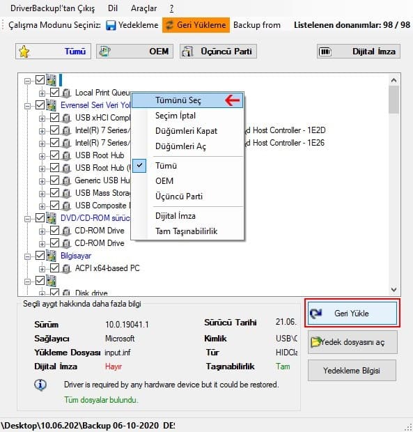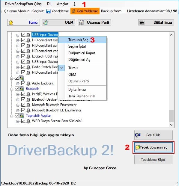 3. Sonrasında yazılım ekranında tüm sürücüler belirecektir,hepsini geri yüklemek için , herhangi bir sürücünün üzerine sağ tıklayıp tümünü seç diyelim (3) ve sağ dipteki “Geri yükle” butonu ile yedeği geri alalım.