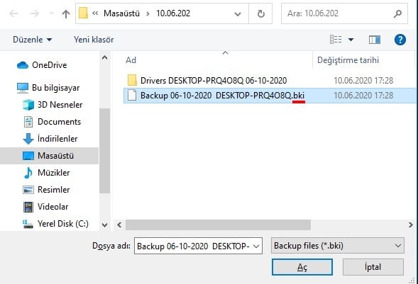 2. Yedeği aldığınız klasör içerisinde yeralan .bki uzantılı dosyayı gösterin ve aç deyin