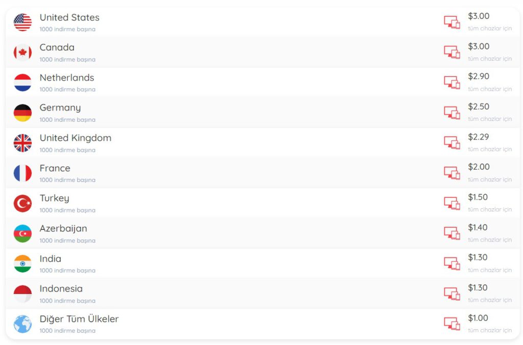 Türkiye dahil diğer ülkelerden ödeme oranlarını aşağıda göreceksiniz.