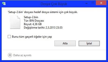 Hedef dosya sistemi için çok büyük hatası çözümü… Harici harddiskimize yada flash belleğimize yüksek boyutlu dosyalar atmak istediğimizde yer olmasına rağmen yukarıdaki fotodaki gibi hata mesajı alırsınız. Bu hatayı 2 şekilde çözersiniz. İlki, harici belleğinizdeki tüm dosyaları yedekler ve ntfs olarak formatlarsınız. Genelde usb bellekler fat dosya sistemini kullanmaktadır. Bu yüzden hata verir ve dediğimiz gibi içindekiler lazım değilse ntfs olarak formatlarsanız sorun düzelecektir. Bir diğer yöntem ise benim favori yöntemlerinden biridir. Diski yada usb belleği formatlamadan yapılacak bir işlem. Çünü içindekileri kopyalamak formatlamak sonra onları tekrar geri atmak ciddi zaman alabileceğinden bu yöntemi seviyorum. Konumuzun devamında yönteme ulaşabilirsiniz.