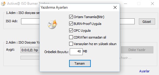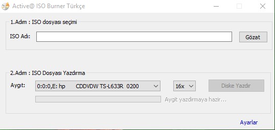 İso yazdırma,cd yazma,dvd yazma,iso dosyası nasıl yazdırılır,iso burn,iso burner,iso dosya yazdma,iso dosya yazdırma tarzında sorulara derman olacak Full ve Türkçe bir programla karşınızdayım. Active@ ISO Burner; ISO dosyalarını CD ya da DVD'ye yazdırabilmenizi sağlayan ücretsiz bir CD ve DVD yazma programıdır. Ayrıca ISO dosyalarının otomatik olarak yazdırılması için çeşitli komut satırı parametrelerini destekler. Active ISO Burner'da yazdırma işlemi ardından veri kontrolü (Verify Data), medyayı otomatik çıkarma ve yazdırma işlemi sonrası bilgisayarı kapatma gibi özellikleri bulunuyor.
