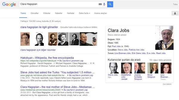 Google hizmeti olan ve aramada karşımıza çıkan tanıtım kartı kısmında yaşanan bu komiklik halen daha mevcut.Steve Jobs'ın annesi Clara Hagopian Jobs'ı Google'da arama yaptığınızda bahsettiğimiz tanıtım kartında Fetullah Gülen'in fotoğrafı çıkmakta.