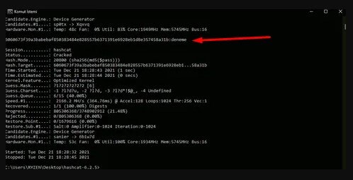 Not: -m 20800 sha256+md5 şifresi çözeceğini belirttiğimiz kod olmaktadır. Hashcat uygulamasının güncellenmesi halinde kod değişiklik gösterebilir. Lütfen bu işlemi yapmadan önce kontrol etmeyi unutmayın.