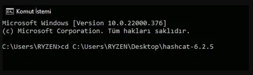 Masaüstüne çıkardığımız hashcat klasörünü açıp klasör yolunu kopyalayalım. cmd penceresini açıp cd dosya_yolu yazıp klasöre erişelim.