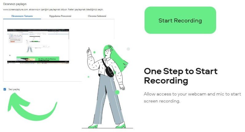 Diğer bir ekran kaydedici sitemiz screencapture.com. Tamamen ücretsiz olan bu siteye girdiğinizde video kaydını başlatmadan önce sizi dört seçenek karşılıyor olacak: microphone (mikrofon), sound (ses), webcam (kamera), watermark (filigran). Baştan söylemek gerekirse, watermark seçeneğini siteyi ücretsiz kullanmak için seçmeniz gerekiyor. Daha sonrasında uygun seçenekleri işaretleyip kaydı başlatmak için “Start Recording” butonuna basabilirsiniz. Video kaydınız tamamlandığında “Download” kısmından indirebilirsiniz.